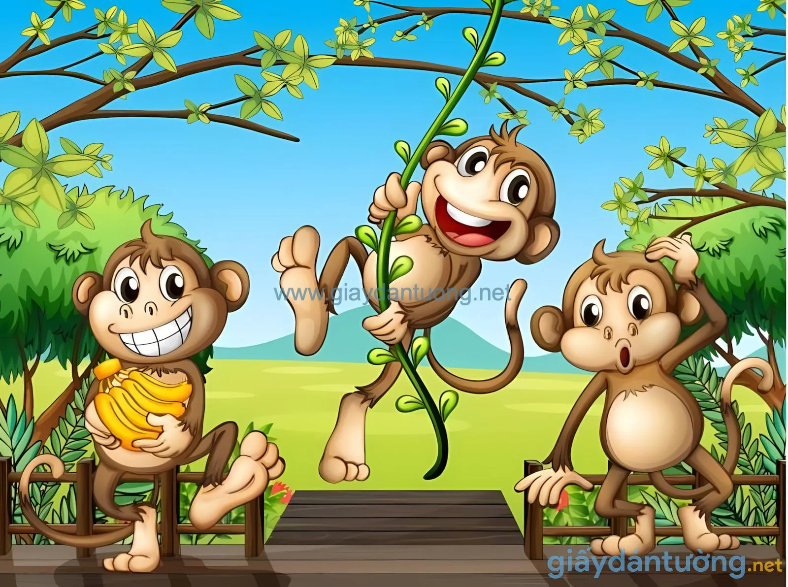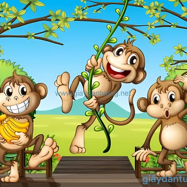 Tranh Dán Tường Hoạt Hình KD050: Ba Chú Khỉ Tinh Nghịch